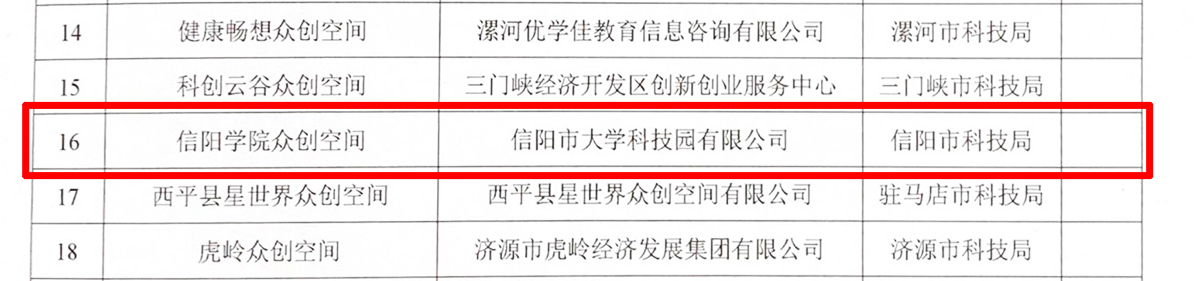 近日,河南省科技厅公布了2018年度河南省众创空间备案名单,我校众创空间经过专家组检查验收和上级批准,获得省级众创空间称号。这是继我校获批“全国大学生KAB创业教育基地”“河南省大学生创新创业实践示范基地”“河南省青年创新创业示范园区”“信阳市众创空间”后,在创新创业方面取得的又一重要成果。