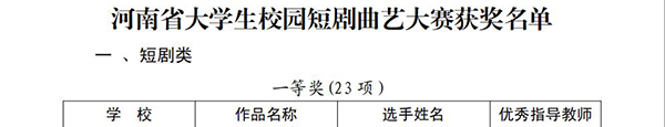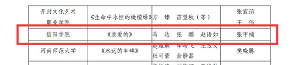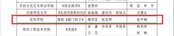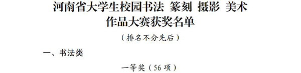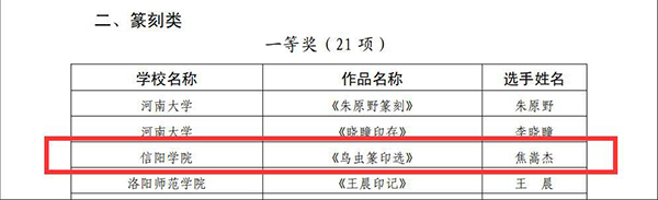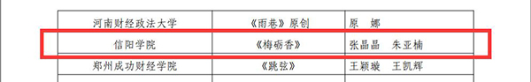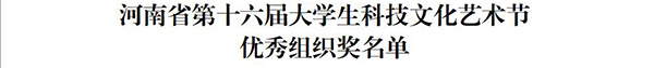 日前,中共河南省委宣传部、河南省教育厅、共青团河南省委、河南省文化厅、河南省学生联合会联合下发了《关于发布河南省第十六届大学生科技文化艺术节系列竞赛获奖作品(个人)和优秀组织单位名单的通知》,信阳学院成绩斐然,荣获优秀组织奖和37项单项奖。其中,一等奖9项,二等奖10项,三等奖18项。