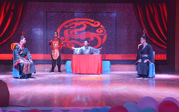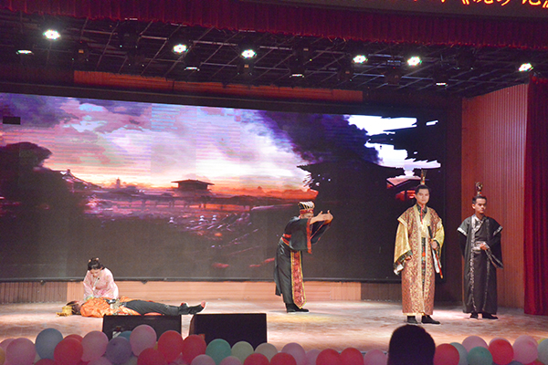 5月9日晚,由社会科学学院主办,会通史学社承办的第六届大型历史史诗剧《浣纱记》在大学生活动中心精彩上演。名誉校长王北生,校长助理杨高伟,有关单位负责人陈录生、李青峰、邓荣娟、张富庄、李赟及600余名师生观看了此次演出。