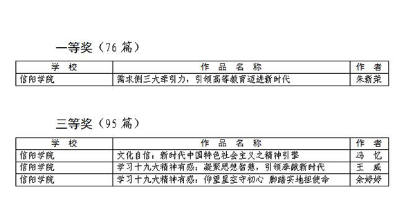近日,省教育厅公布了《“凝聚思想智慧 引领奉献新时代”全省高校社科战线学习宣传贯彻党的十九大精神主题征文获奖名单的通知》文件,我校社会科学学院博士朱新荣撰写的论文《需求侧三大牵引力,引领高等教育迈进新时代》荣获一等奖,社会科学学院教师冯忆撰写的论文《文化自信:新时代中国特色社会主义之精神引擎》、艺术学院教师王威撰写的论文《学习十九大精神有感:凝聚思想智慧,引领奉献新时代》、学生工作部余婷婷撰写的论文《学习十九大精神有感:仰望星空守初心,脚踏实地担使命》荣获三等奖。