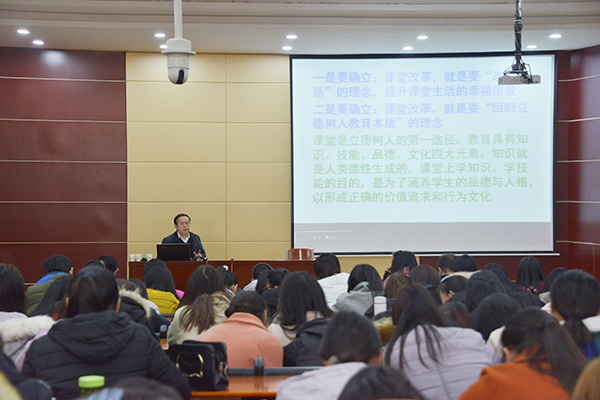 12月8日下午,应我校邀请,郑州市教育局副局长田保华副研究员在我校图书馆102学术报告厅作了题为《基于核心素养的课堂革命——道德课堂的责任与使命》的学术报告。社会科学学院院长陈录生、党总支书记李赟和200余名师生聆听了此次报告,报告会由陈录生主持。名誉校长王北生、副校长毛海涛热情接待了田保华一行。