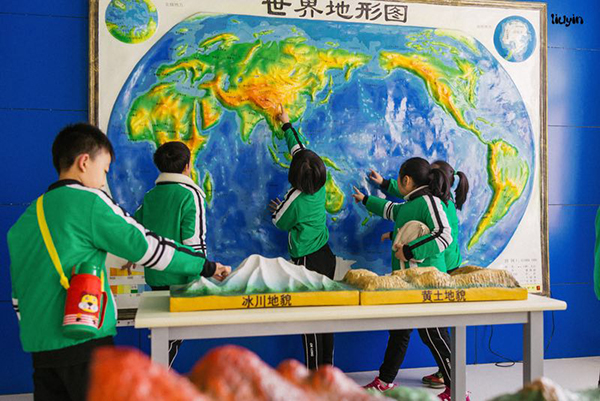 小朋友们还参观了地质地貌实验室、天文气象实验室。理工学院地理专业教师白玉娜为小朋友们准备了精彩的讲解,带领小朋友观察变质岩、沉积岩和岩浆岩的样本,以及矿物标本。根据地震、海岸地貌、黄土地貌、喀斯特地貌、冰川地貌、火山地貌等模型讲述了地貌的成因及类型。通过观察天球仪、地球仪、旋转星象仪并利用太阳系八大行星运动的动态模型以及全国地形和世界地形模具的语音系统讲解,帮助小朋友建立地理的时空观。