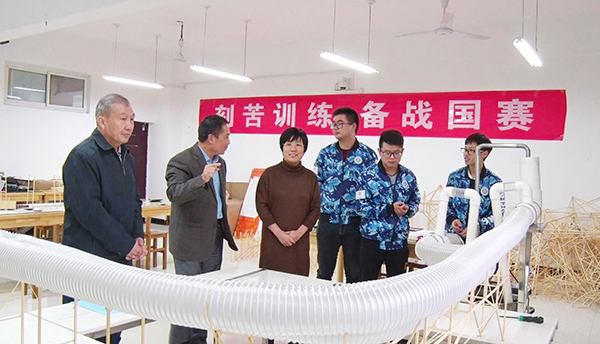 我校由土木工程学院副院长潘卫国任领队,土木工程学院院长王钢城、青年教师付善春、王亮任指导教师,王福龙、朱勇杰、雷亮等三名学生组成的代表队第一次参加此类比赛。出发前,我校理事长高云来到土木工程学院,亲切慰问参赛师生,鼓励大家要克服困难,沉着应战,以饱满的精神状态参加比赛。理事长的鼓励给参赛师生带来了极大的信心,师生们深受鼓舞,士气大振。经过18小时的模型制作和近11小时的模型加载,我校以全国总排名第19的成绩喜获二等奖。