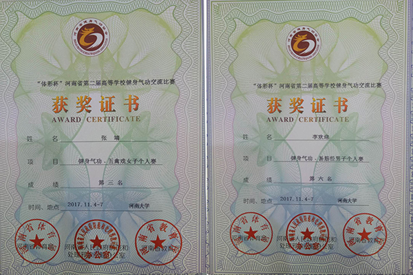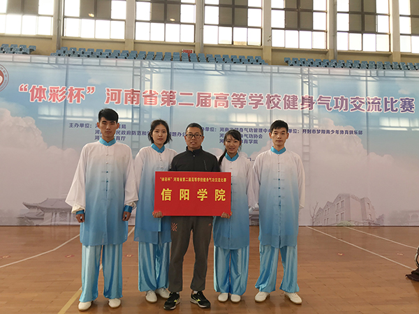 11月5-7日,河南省第二届高等学校健身气功比赛在河南大学举行。我校由公共体育部教师史志涛、理工学院学生赵振利、李欢迎、付朝阳、文学院学生张靖组成的代表队参加了本次比赛,并荣获多项荣誉。史志涛荣获优秀教练员荣誉称号,张靖获得健身气功五禽戏个人项目第三名及“体育道德风尚奖”,李欢迎获得健身气功·易筋经个人项目第六名,健身气功五禽戏团体项目第六名等。
