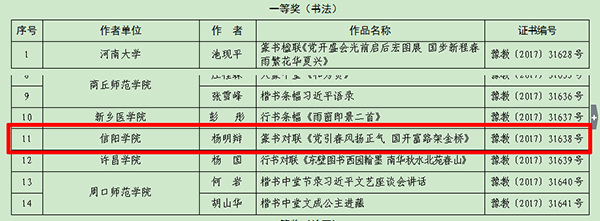 日前,中共河南省委高校工委、河南省教育厅印发了《关于公布2017年度河南省高校统战“同心”书画展作品评选结果的通知》,我校文学院杨明辩老师的篆书对联《党引春风扬正气 国开富路架金桥》荣获一等奖(证书编号豫教〔2017〕31638号);张德臣老师的行书条幅《腹有诗书气自华》荣获三等奖(证书编号豫教〔2017〕31790号)。
