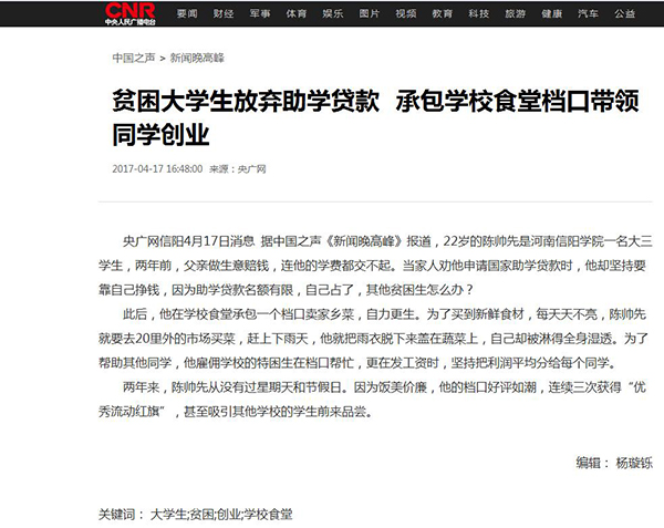 近日,我校社会科学学院2014级心理学专业陈帅先的创业事迹受到了人民日报、中国教育报、央广网、参考消息网、凤凰网、河南日报、河南电视台、大河报、信阳日报、信阳电视台、信阳晚报等众多主流媒体的广泛关注,已经陆续刊发相关报道,并获得了腾讯、今日头条、天天快报、新浪微博等多个新媒体资讯平台的积极推送,在全国高校师生中引起了热议,许多同学表示要向他学习,自立自强,勤奋锻炼,乐于助人,成为社会需要的有为青年。