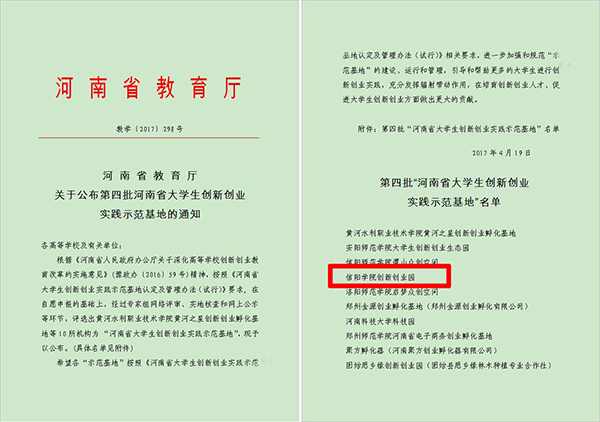 根据《河南省人民政府办公厅关于深化高等学校创新创业教育改革的实施意见》(豫政办〔2016〕59号)精神,按照《河南省大学生创新创业实践示范基地认定及管理办法(试行)》要求,我校于2016年12月提交了申报材料,经过专家组网络评审、实地考察和网上公示等环节,河南省教育厅共从全省五十余家单位中评选出包括“信阳学院创新创业园”在内的10所机构为“河南省大学生创新创业实践示范基地”。