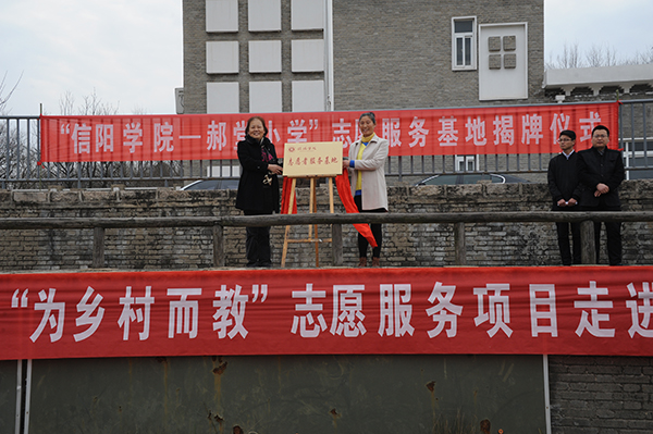 仪式上,张莉、杨文平共同为志愿服务基地揭牌。郝堂小学校长杨文平对我校师生走进郝堂开展志愿服务活动表示热烈欢迎,她希望我校志愿者在郝堂小学对口共建、拓展学生兴趣爱好、开展校内外主题实践活动等方面给小朋友带来帮助。胡秀云介绍了我校和郝堂小学共建志愿服务基地的合作方案。我校志愿者代表高金影,向大家分享了参与“为乡村而教”志愿服务项目的感悟与心得。
