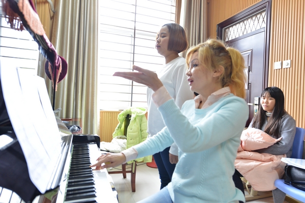 说起中国,两位外教满心欢喜,语调也顿时提高了许多。NATALLIA老师告诉我们:“从小父亲就会向我讲一些有关中国的知识,例如:长城、黄河……中国的美让我感到震撼。我很喜欢中国,喜欢中国文化,现在能有机会来到美丽的信阳学院工作,我感到非常开心。”OKSANA老师说,“我喜欢中国,也喜欢信阳,这里的风景很美,老师和同学们都很友好。”当提及她们的学生“小石榴”的声乐学习时,OKSANA老师不禁点头称赞,“中国孩子在音乐方面比较有天赋,特别是男高音,非常棒!”