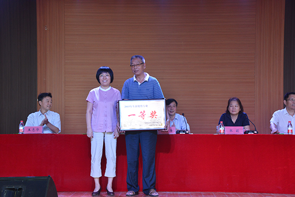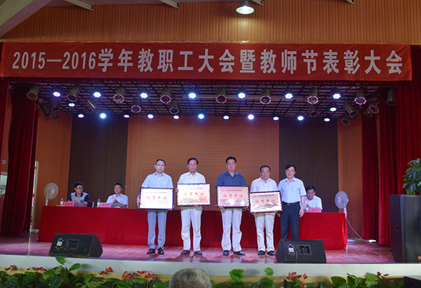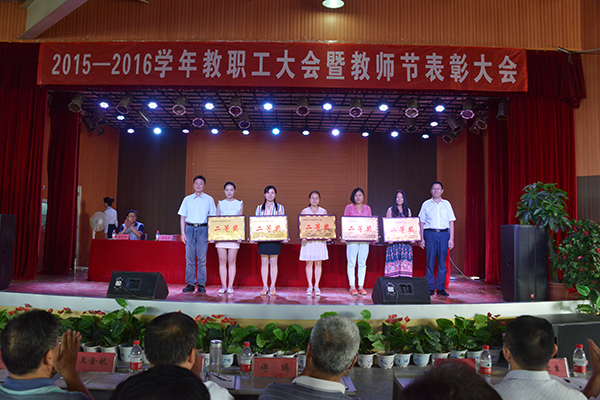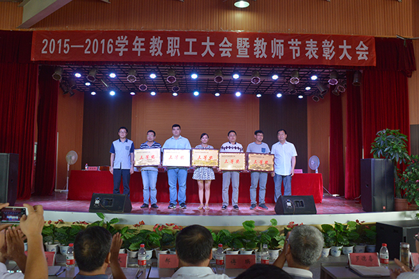 在喜庆的气氛中,大会举行了隆重的颁奖仪式。院领导共同为吴新静、张奎、陈小静、王娜、王斐、霍豆豆、王冬冬、张枭、贾彦茹、李欢、剧红梅11位获得“优秀教师”称号、杜泳林、王章力2位获得“省级文明教师”称号的教师颁发了荣誉证书;施昌海为获得2014—2015学年目标管理考核优秀单位的负责人社会科学系主任陈录生、外语系主任罗德喜、理工系主任魏明坤、数学与计算机科学系主任郝涌颁发了奖牌;高云向获得2015年生源优势专业一等奖的汉语言文学专业代表颁发了奖牌;傅洪涛、王志华向获得2015年生源优势专业二等奖的英语、教育学(小教方向)、财务管理、经济学(电算会计方向)、环境设计专业代表颁发了奖牌;毛海涛、杨高伟向获得2015年生源优势专业三等奖的数学与应用数学、学前教育、汉语国际教育、地理科学、历史学专业代表颁发了奖牌。获奖教师代表张枭、学生代表屈笑笑分别作了精彩发言。