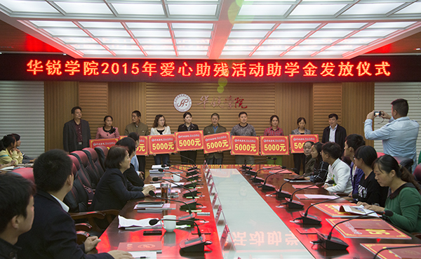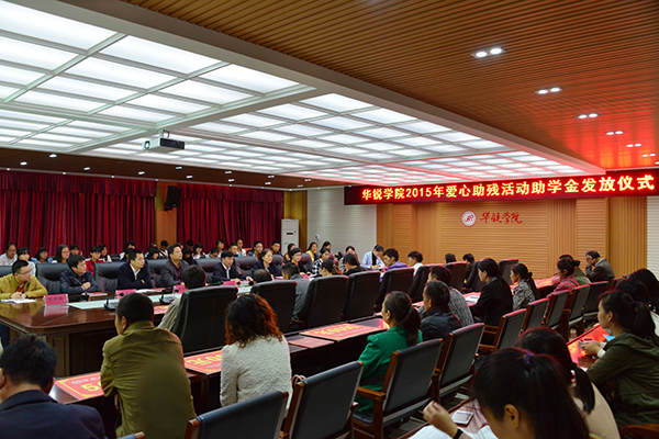 10月8日上午,学院2015年爱心助残活动助学金发放仪式在行政楼208会议室隆重举行。信阳市残疾人联合会副理事长孙立亮、教育就业部主任余翎,我院院长施昌海、党委书记张莉及有关部门负责同志,与来自全市的20名受助残疾学生、残疾人子女及家长集聚一堂。助学金发放仪式由张莉主持。