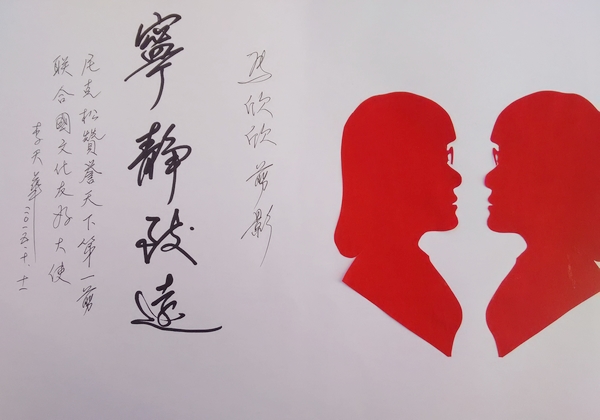 在他的世界观里,学习剪影艺术就是要有所用,有所为,有所乐。因此,“走五百校,传文化经,行万里路,树中华魂。”便成为他一直坚持不懈的目标。到今天,他已自费前往398所高校进行讲学,向广大青少年展示剪影艺术的魅力。与此同时他更是将剪影艺术带上了国际舞台,他曾应邀出访30多个国家进行文化交流,一位海外华侨看了他的作品之后赞叹道:“古有神笔马良,今有神剪天华!”在老人眼里最值得的骄傲的两件事就是他被尼克松总统誉为“天下第一剪”和在埃及举办个人作品展,并由联合国颁发了荣誉证书。