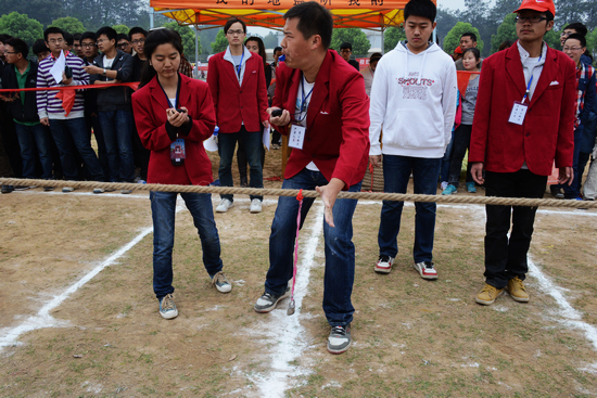 操场上最热闹的地方莫过于拔河比赛的现场,这样的团体比赛不仅是力量的对决,更是对技巧与团结的考验。比赛前运动员们齐声高喊口号,为自己鼓励加油,只见同学们脚对着脚,身体向后压倒,最后一名同学将绳子系在腰上,随着一声哨响,比赛开始了,大家奋力向后拉,脸涨得通红,手上的青筋凸起,直到把对方拉过来。在赛场旁,一位土木系老师在谈及拔河比赛时说:“拔河是一种团结、奋发向上、振奋人心的运动,我不仅喜欢这项运动,更喜欢为同学们加油,呐喊。这让我看到了华锐学子拼搏、团结的精神,我们也希望大家多锻炼,在华锐掀起健康运动的风尚。”