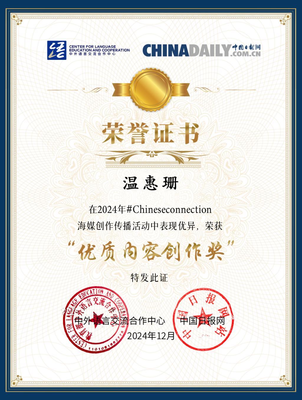 在泰国的教学经历,不仅让我收获了珍贵的师生情谊,更让我在专业能力上得到了显著提升。我还积极参加国际中文教育志愿者俱乐部举办的各项活动,努力运营我的海外社交软件ins、脸书等,用视频和图文的形式向大家分享我的志愿者生活经历。而我的活跃表现也被中国日报授予了“优质创作者”的荣誉称号,更在语合中心“时光邮局”的征文活动中获得了一等奖。