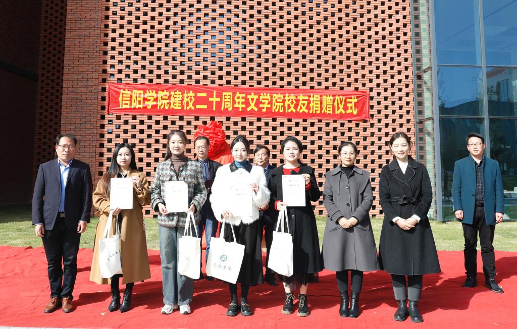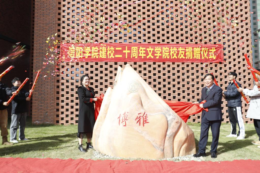 2023年11月16日上午,在信阳学院建校20年之际,学校文学院校友2013级李玲玲、2014级欧阳利妍、2015级杜志洋、杨柳、严瑞等向母校赠送一方镌刻着“博雅”的文化石,以感谢和铭记母校的培育之恩和恩师的教诲之情。