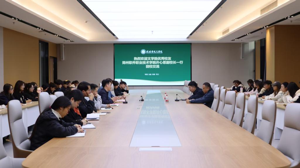 10月27日下午,文学院2009级优秀校友郑州软件职业技术学院副校长许心思一行回校交流,同行的有该校党委副书记胡银着。文学院党总支书记李赟、土木工程学院党总支书记徐远东、文学院行政秘书陈俊、学工干部何军华、团总支书记段艳婷及部分学生干部参加座谈交流,由李赟书记主持。